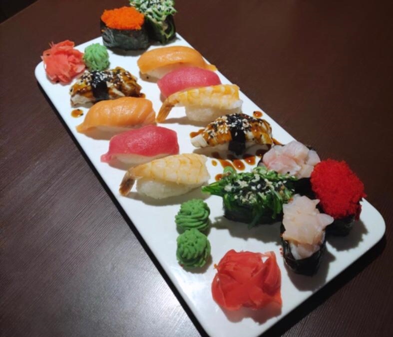 Состав: Суши нигири с лососем, суши нигири с угрем, суши нигири с тунцом, суши нигири с креветкой, гункан с чукой, гункан с тобико, гункан с морским окунем