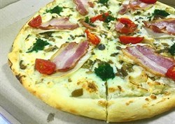 Белые грибы, бекон, филе куриное, шпинат, моцарелла, сливочный соус, помидоры черри, орегано.